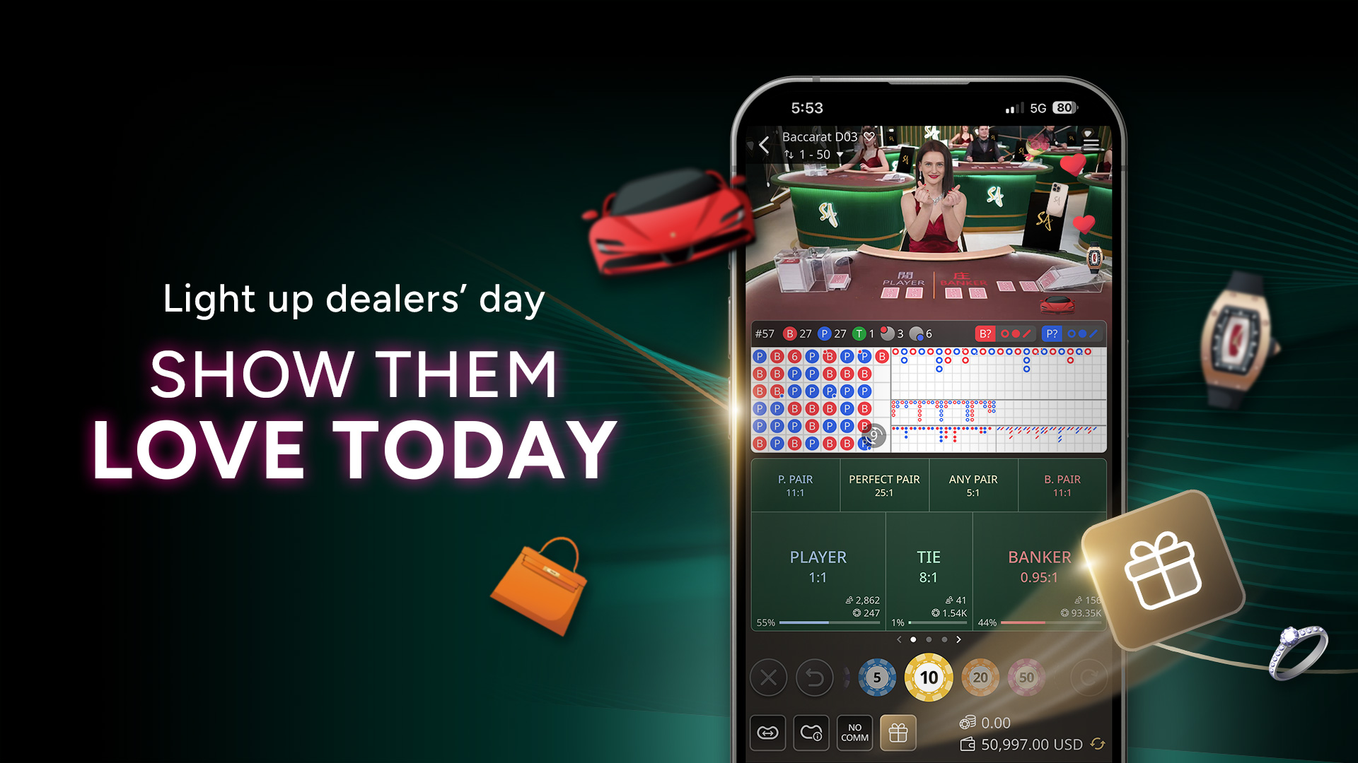 To enhance interactivity between dealers and players, we have introduced sending gifts into our tables where players can send eight different tiers of gifts to the dealers and game presenters. From hearts and flower bouquets to luxurious watches and super cars, each of them represents a value that will be received by the game presenters instantly. Dealers can see which players send out gifts in real time, and will interact with players who tip generously!